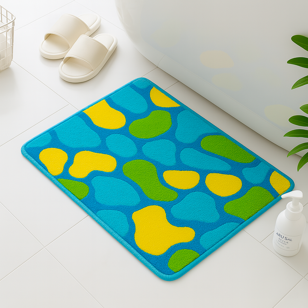 Feblilac Colorful Abstract Bath Mat – Non-Slip Bathroom Rug with Blue, Yellow & Green Modern Design, Soft and Absorbent